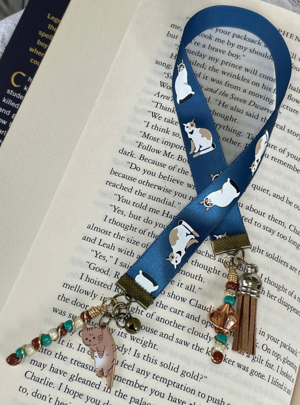 - This is a Handmade bookmark out of ribbon and charms with accessories and beads. They are adorable and would make the perfect gift for any "BOOK LOVER" in your life, or just the perfect little gift for yourself.